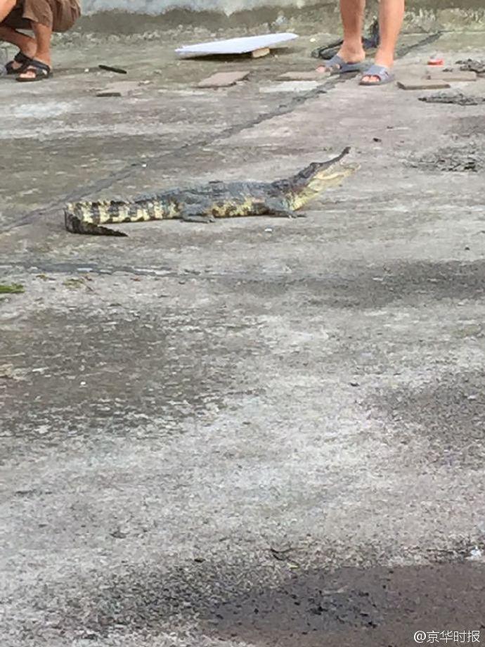 “鱷魚(yú)長(zhǎng)約一米,身上有花斑,看著挺可怕的,還好沒(méi)有傷到人”。