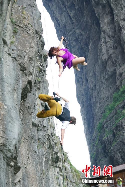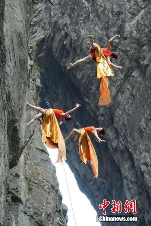 9月13日,美國BANDALOOP高空舞蹈團在湖南張家界天門山的懸崖絕壁間盡情展現(xiàn)“垂直舞蹈”的藝術(shù)與魅力,其優(yōu)雅而驚險的舞姿與鬼斧神工般的自然奇景融合、互動,吸引了不少游客駐足欣賞。中新社發(fā) 向韜 攝