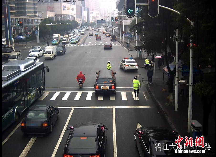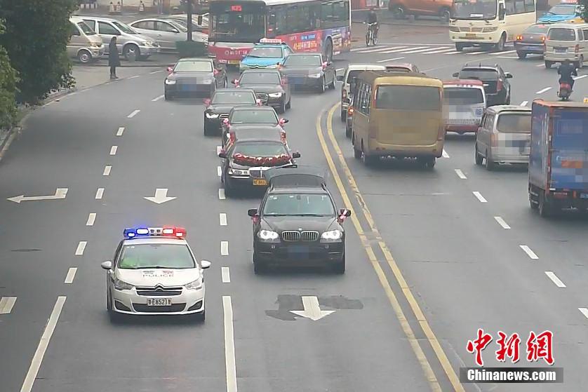 2月22日,湖北宜昌一位新郎在迎親時(shí),迎親車隊(duì)的頭車因涉嫌套牌被交警查獲。在新郎家屬和交警溝通后,當(dāng)?shù)亟痪诵曰瘓?zhí)法,先“開(kāi)道護(hù)送”,迎親結(jié)束后才扣下套牌車。圖為警車“護(hù)送”新人完成儀式。石寧 攝