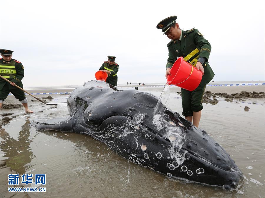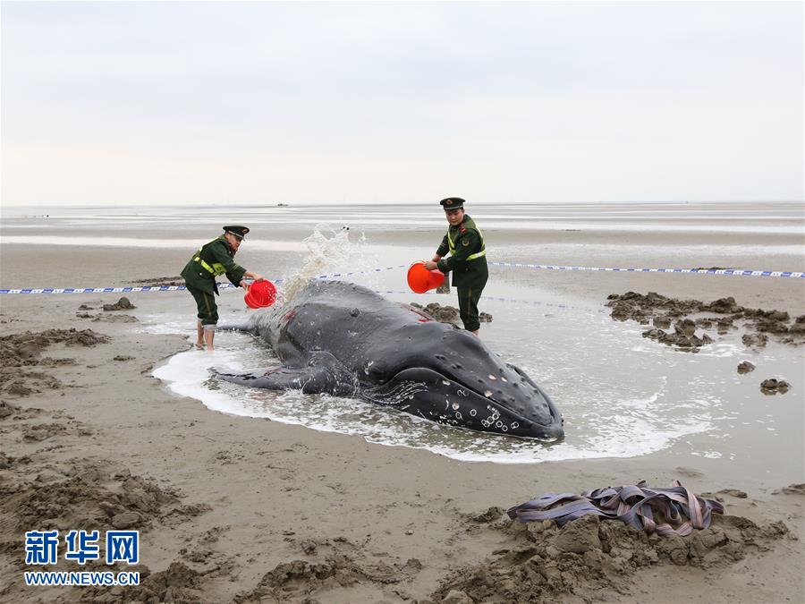 11月13日,邊防民警向擱淺的座頭鯨潑水以保持其體表濕潤。