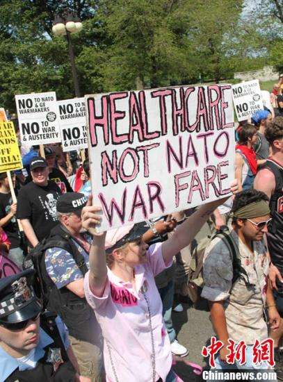 北約峰會(huì)5月20日在芝加哥開幕,萬(wàn)余名示威者掀起規(guī)模空前的游行抗議活動(dòng)。圖為當(dāng)天游行中的一個(gè)場(chǎng)景,右側(cè)為正在執(zhí)勤的警察,中為一名美女示威者,左側(cè)為一名參加過(guò)阿富汗戰(zhàn)爭(zhēng)的美國(guó)退伍軍人。中新社發(fā)李洋攝