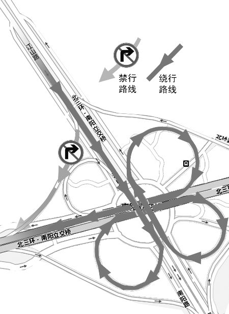 鄭州交巡警支隊有關(guān)負(fù)責(zé)人建議司機在北環(huán)立交橋上通過連續(xù)轉(zhuǎn)彎實施右轉(zhuǎn)(可參照圖示),具體如下: