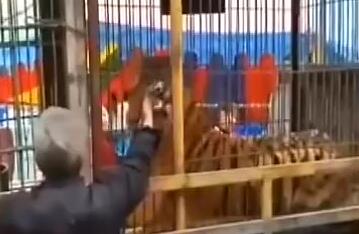 老人伸手進籠 被老虎一口咬住