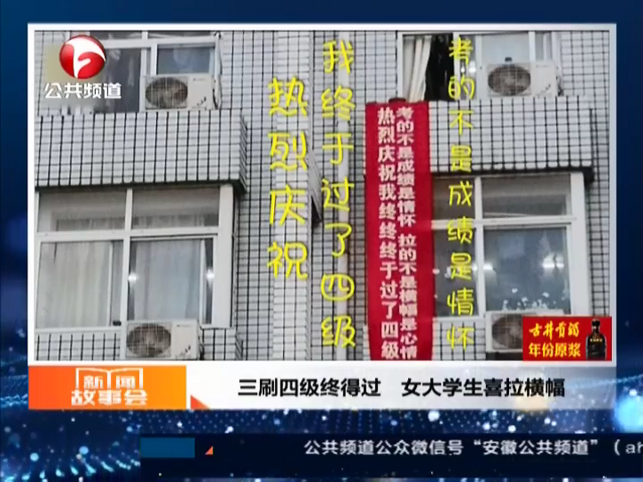 女大學(xué)生喜拉橫幅四級(jí)終得過(guò)