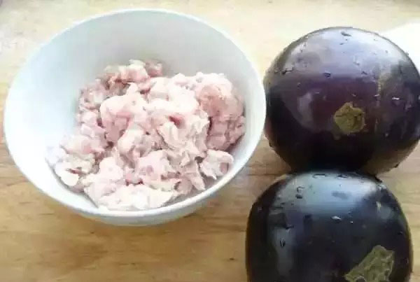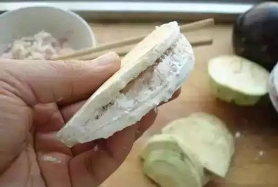4. 把肉末填入茄盒中。