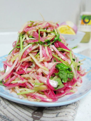 取一個綠皮水果蘿卜,去皮,切絲,加入少許調(diào)料,拌勻即可,做法簡單,味道不錯。在調(diào)料上,加入少許橙汁或檸檬汁,讓蘿卜入口后口感更豐富而有層次,有著淡淡的橙子香氣?!?/p>