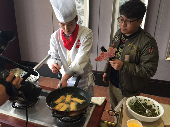 去皮五花肉剁成帶有顆粒感的肉餡,調(diào)好味道,炒熟、晾涼就可以用了。炒餡的時候師傅還用到了具有濃郁開封特色的調(diào)味料,肉餡炒好后韭菜的加入也是頗為講究的,最后像疊被子一樣將春卷包好,下鍋炸成金黃色就可以了!你看,這酥脆的外皮很誘人對不對!