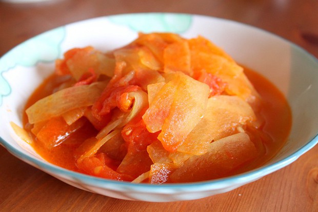 2. 鍋內(nèi)熱油,放姜絲煸香,再放入西瓜皮大火翻炒3分鐘,放入番茄,翻炒均勻后,加入番茄醬、生抽、鹽、翻炒3分鐘后加水,加蓋小火燉;