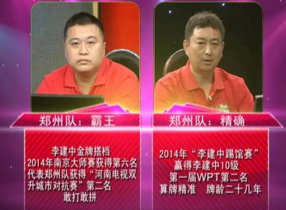 鄭州隊(duì)派出了“霸王”和“精確”?!鞍酝酢痹?015年“李建中踢館賽”期間,與李建中是金牌搭檔;在2014年南京大師賽上獲得第六名;曾代表鄭州隊(duì)獲得“河南電視雙升城市對抗賽”第二名,經(jīng)?;钴S在雙升銀屏的舞臺上。