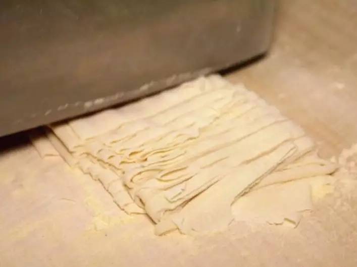 高筋面粉來(lái)和面,用搟面杖反復(fù)搟二十多分鐘,直到面餅微薄透光。這樣做出的面條,經(jīng)過煮制后口感才會(huì)筋道軟滑。