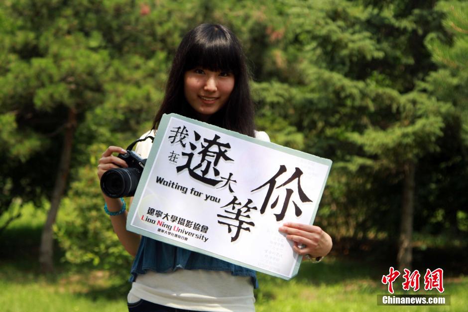 6月23日,美女拿著“我在遼大等你!的牌子在拍照片。當日, 遼寧大學攝影協(xié)會推出一組遼大創(chuàng)意“招生名片”照片,數位帥哥靚妹更是抓人眼球。中新社發(fā) 于海洋 攝