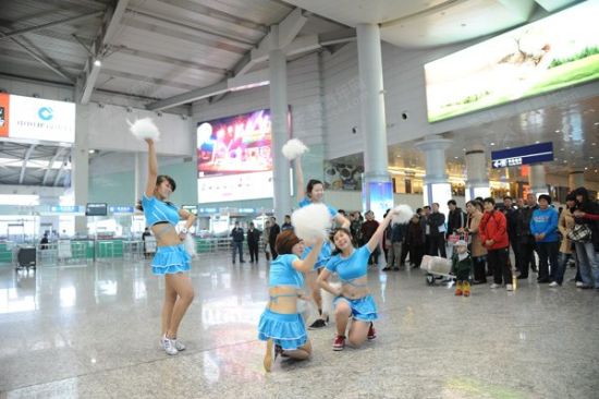 為穩(wěn)定旅客情緒,大連機(jī)場請來美女拉拉隊員跳操,引來眾多旅客圍觀。新青年網(wǎng)