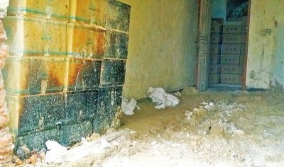 昨日15時35分,位于鄭州市107輔道以北的該處八堡村民房內(nèi),至少兩個房間碼放的方形紙箱堆積有兩米多高,遠(yuǎn)遠(yuǎn)就能嗅到刺鼻氣味。紙箱外包裝及紙箱內(nèi)的液體塑料包裝瓶體,均無物品名稱、生產(chǎn)廠家等標(biāo)識。房間內(nèi)墻體上的一張貼畫有一半被燒掉發(fā)黑,地面有白色的粉末狀不明物質(zhì)和摻雜的黃土。