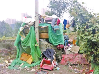 他們從花園路劉莊到鄭上路,走了近2個小時。走到鄭上路須水河西岸時,發(fā)現(xiàn)在一塊荒蕪的墳地中,有一窩棚,隱約看到有身影在走動。近前看到,一位瘦黑的老人站在雨里,正在一簡陋土灶上煮面條。老人身上的衣服已淋濕,陪老人的是一條流浪狗,狗是老人撿的。窩棚很小,僅能容下一人,蜷縮著才能躺下。由于窩棚漏雨,鋪蓋內也是濕的。