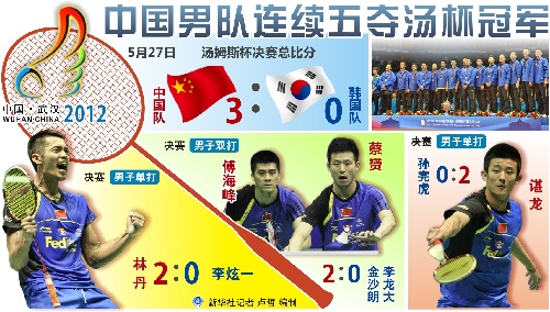 北京,2012年5月27日 圖表:中國男隊連續(xù)五奪湯杯冠軍 新華社記者 盧哲 編制