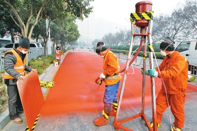商務(wù)內(nèi)環(huán)的輔道上,一臺大型鋪路機正在施工,一條彩色道路如一道長虹綿延伸向遠方。據(jù)城市綠道施工負責人稱,他們已在此施工4天,正在為商務(wù)內(nèi)環(huán)鋪設(shè)長約3.8公里的彩色瀝青,30多名工作人員加班加點,預(yù)計12日綠道工程能全面竣工。
